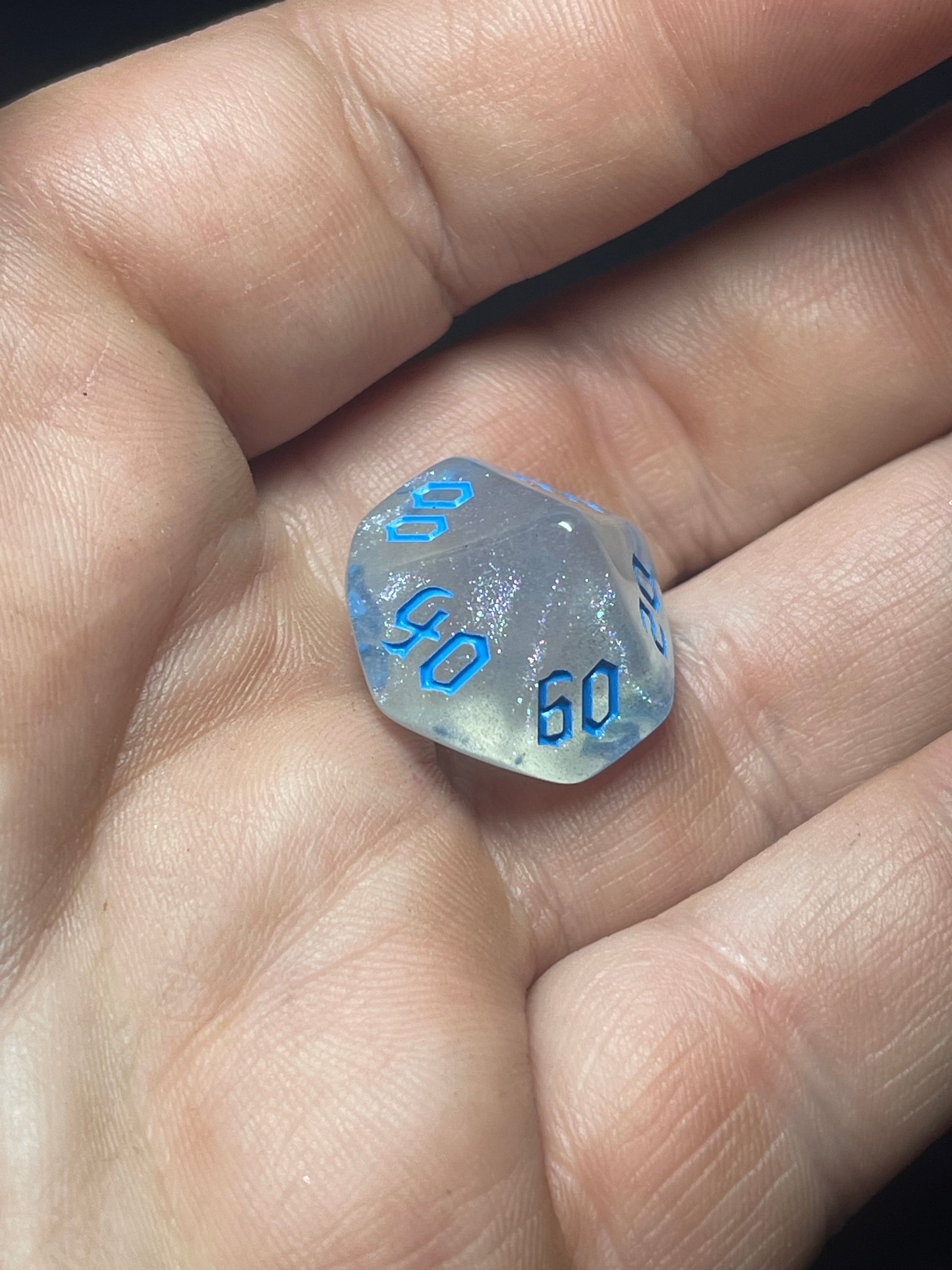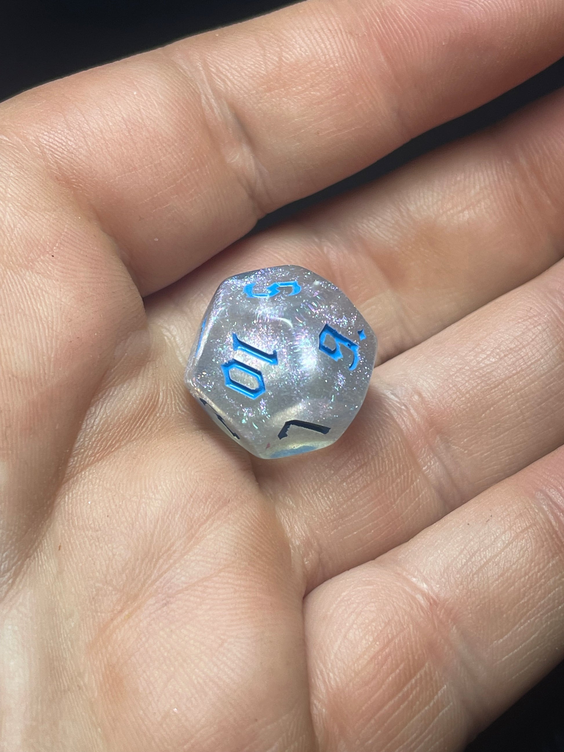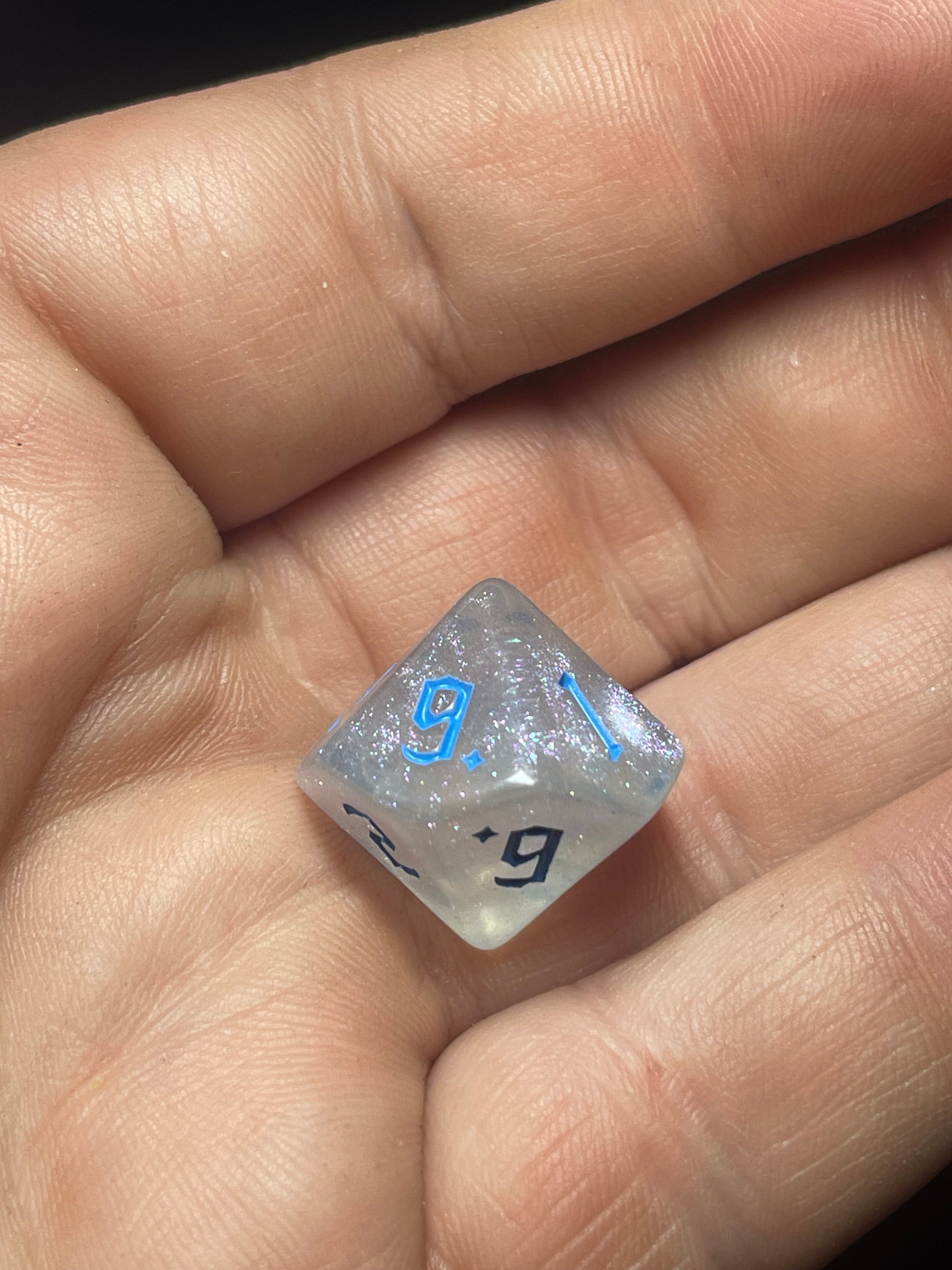 Elevate your game with the Frosted Starlight 7-piece dice set, where icy translucence meets sparkling glitter for a celestial feel. Each acrylic die features bright blue numbers that resemble glowing constellations against a winter night sky, adding a touch of magic to every roll. Perfect for bringing whimsy and wonder to your D&D adventures.