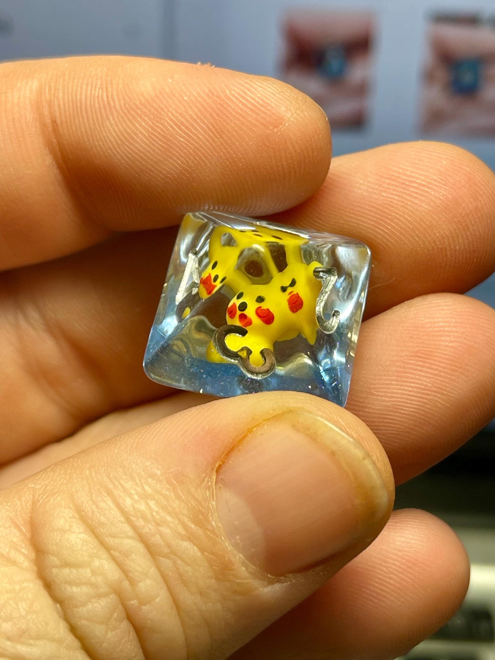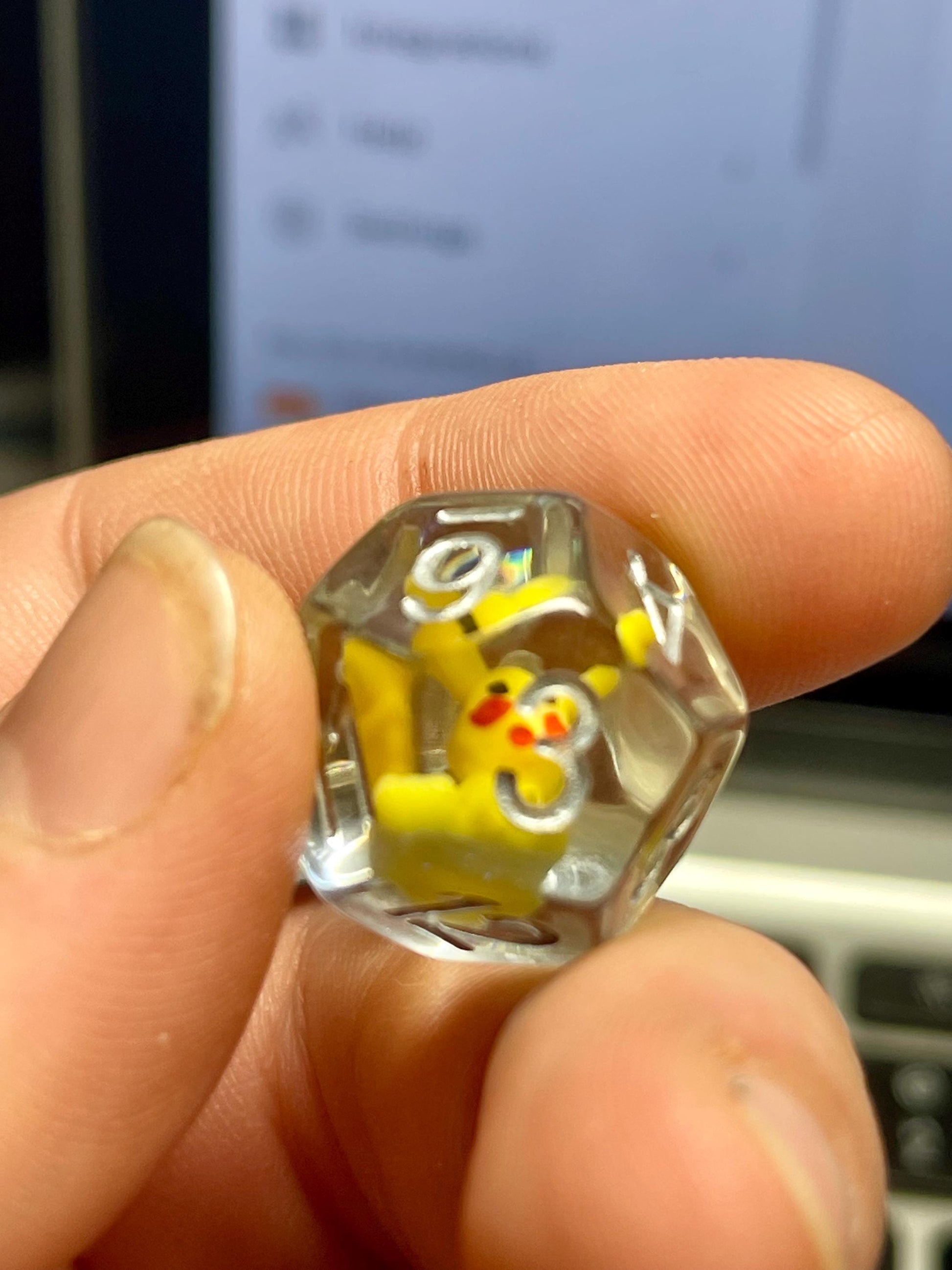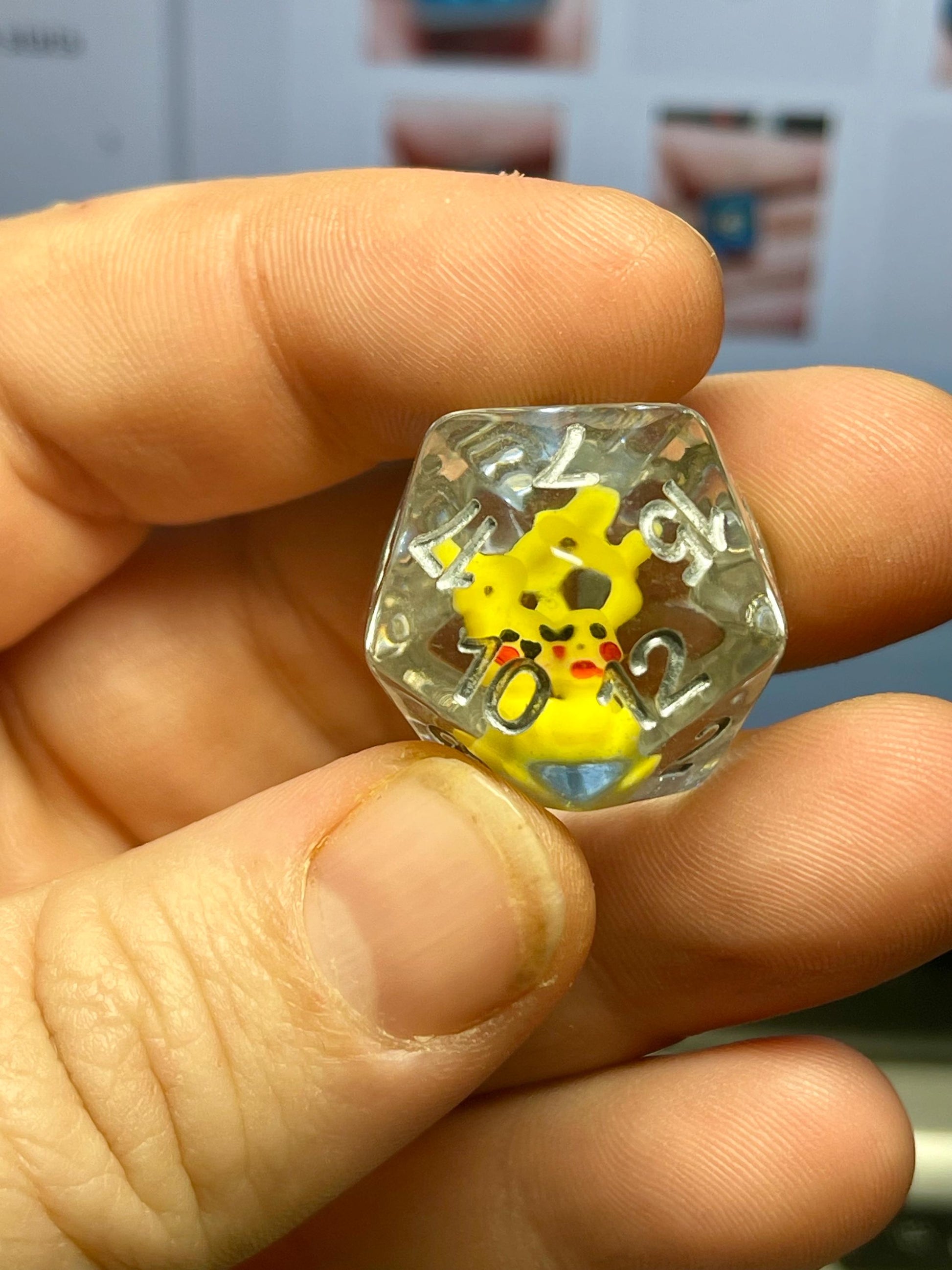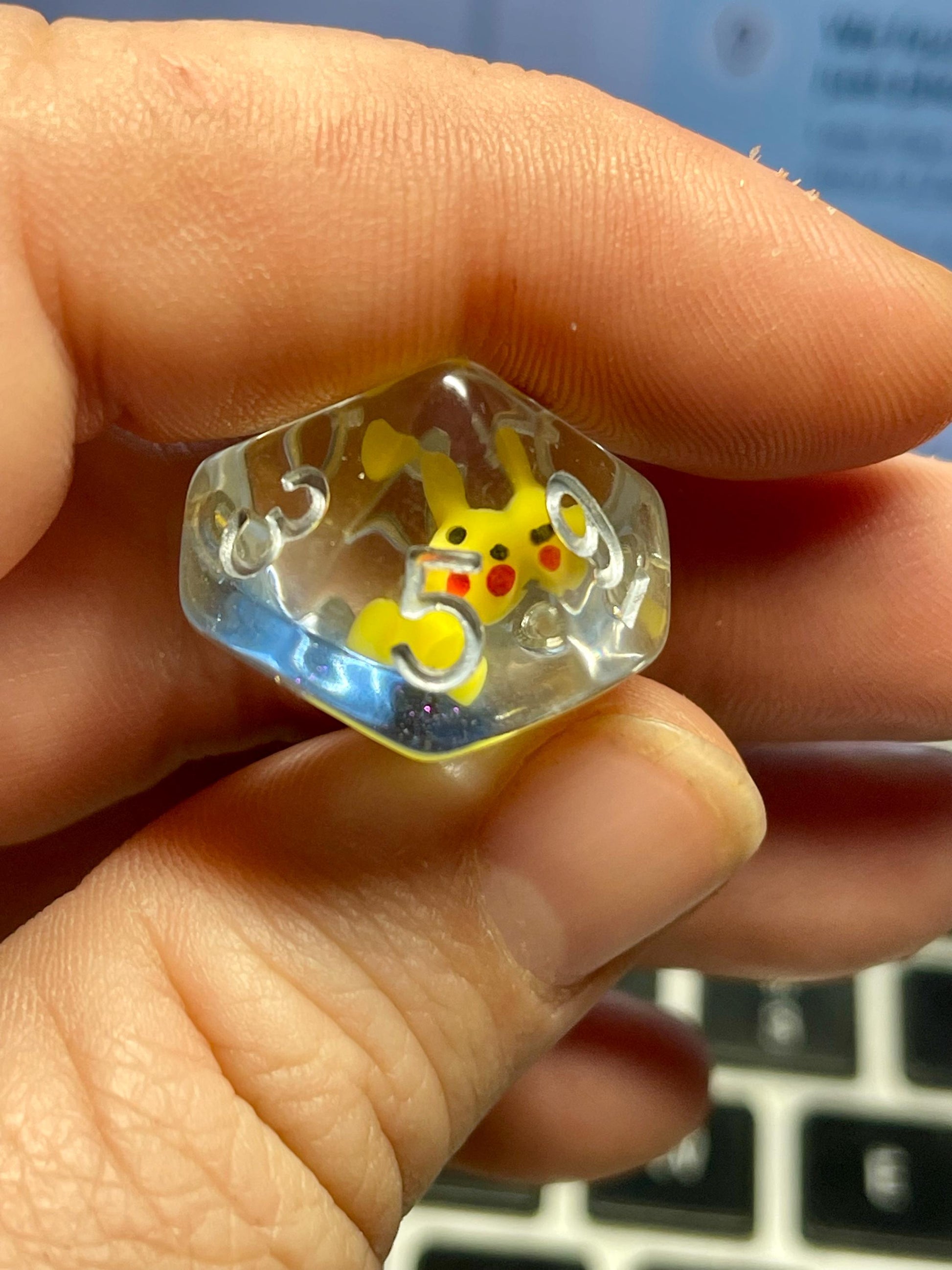 Take your tabletop gaming to the next level with our Pikachu Dice! Complete your collection of D&D dice with these 7pc resin dice featuring glittery Pokémon designs. Roll with confidence and add a touch of adventure to your games. Catch ‘em all at the gaming table!