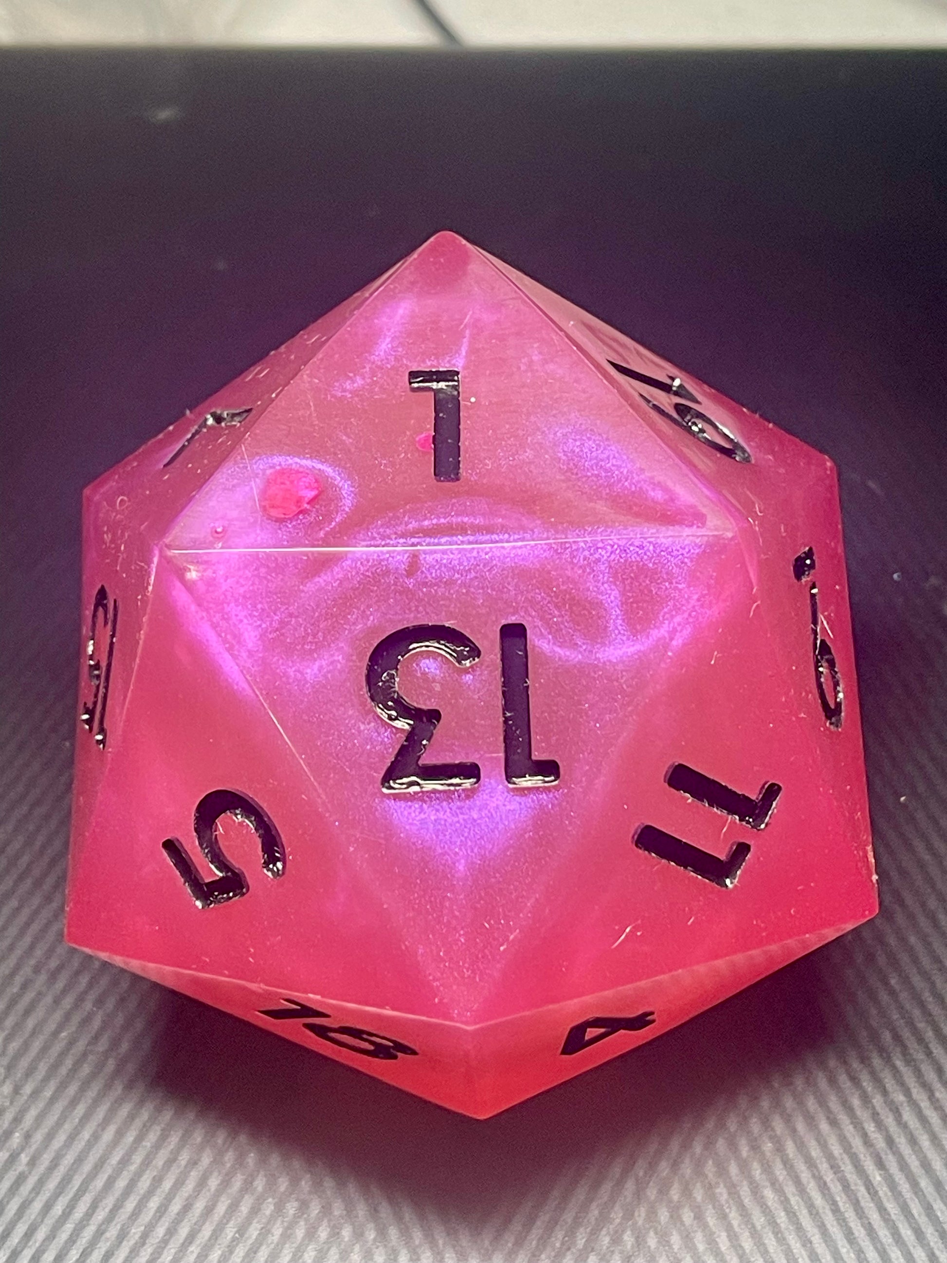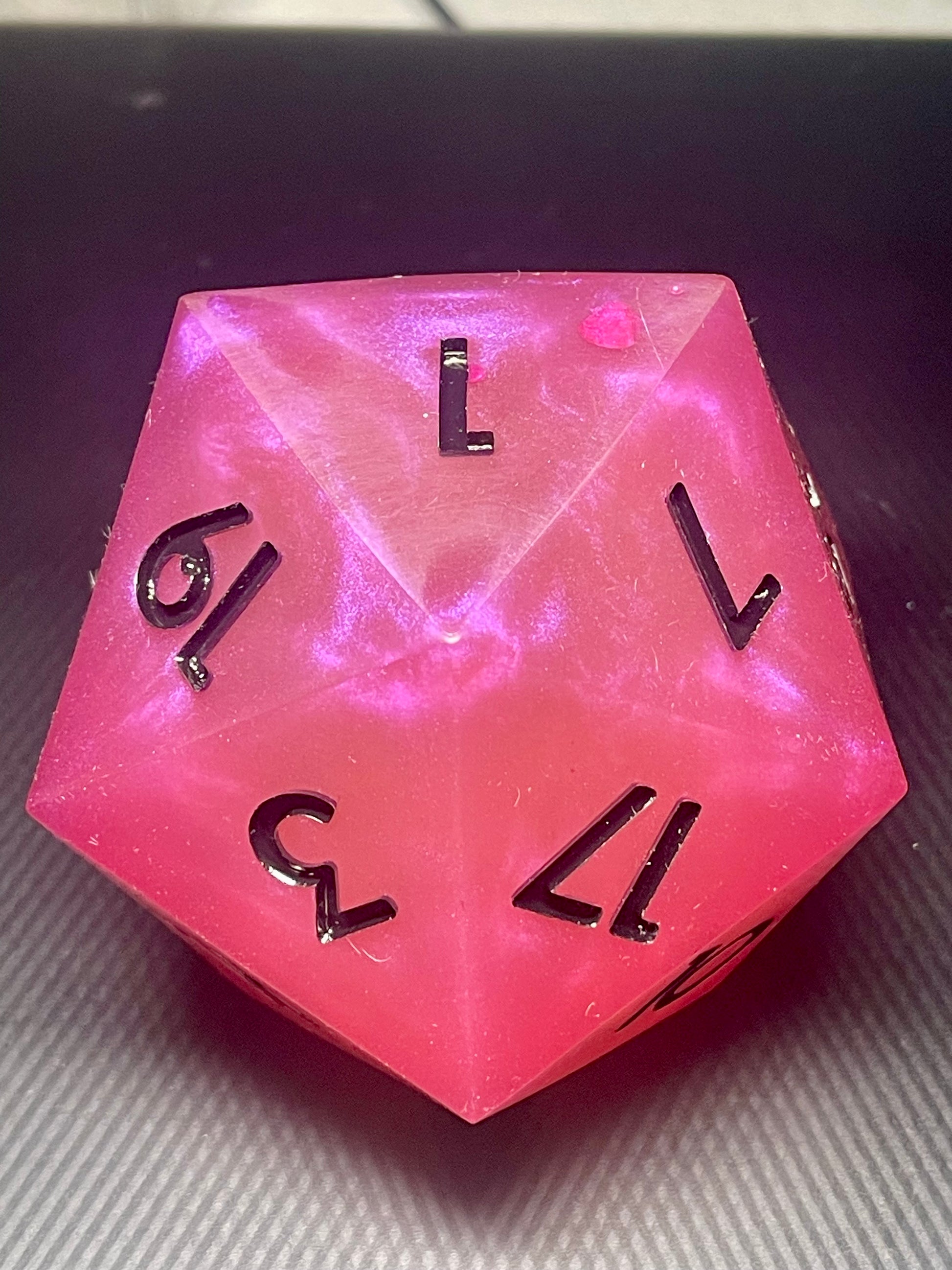 The Blushbringer, is a dazzling 100mm twenty-sided die forged for those who roll with style and summon chaos with charm. This oversized pink powerhouse features a shimmering pearlescent finish and bold black numbering, making it both a showstopper and a statement piece at any gaming table.